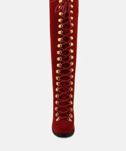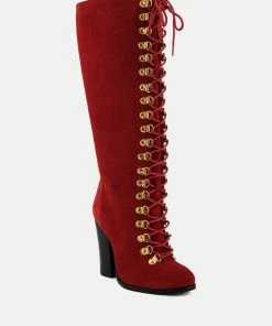Handcrafted in high-quality genuine leather, this pair of high heeled calf boot has antique metal eyelets which exhibits a vintage charm. The side zipper opening makes it a comfy pair to wear. These are perfect as after party shoes or bachelorette heels.