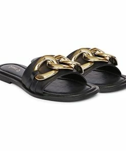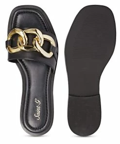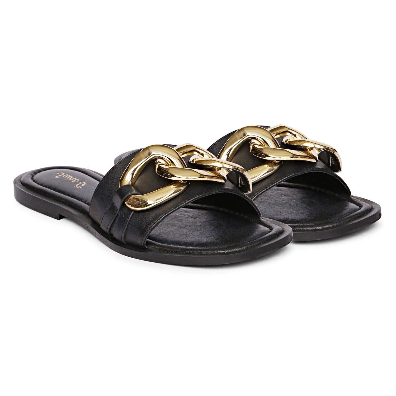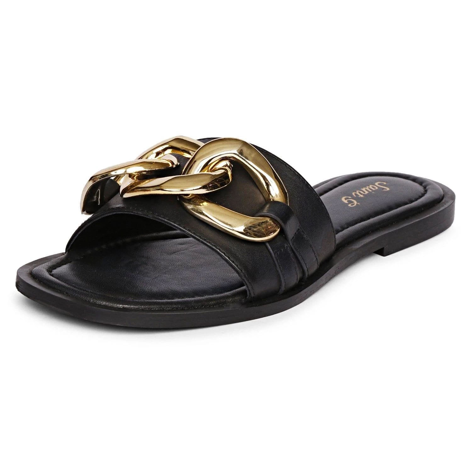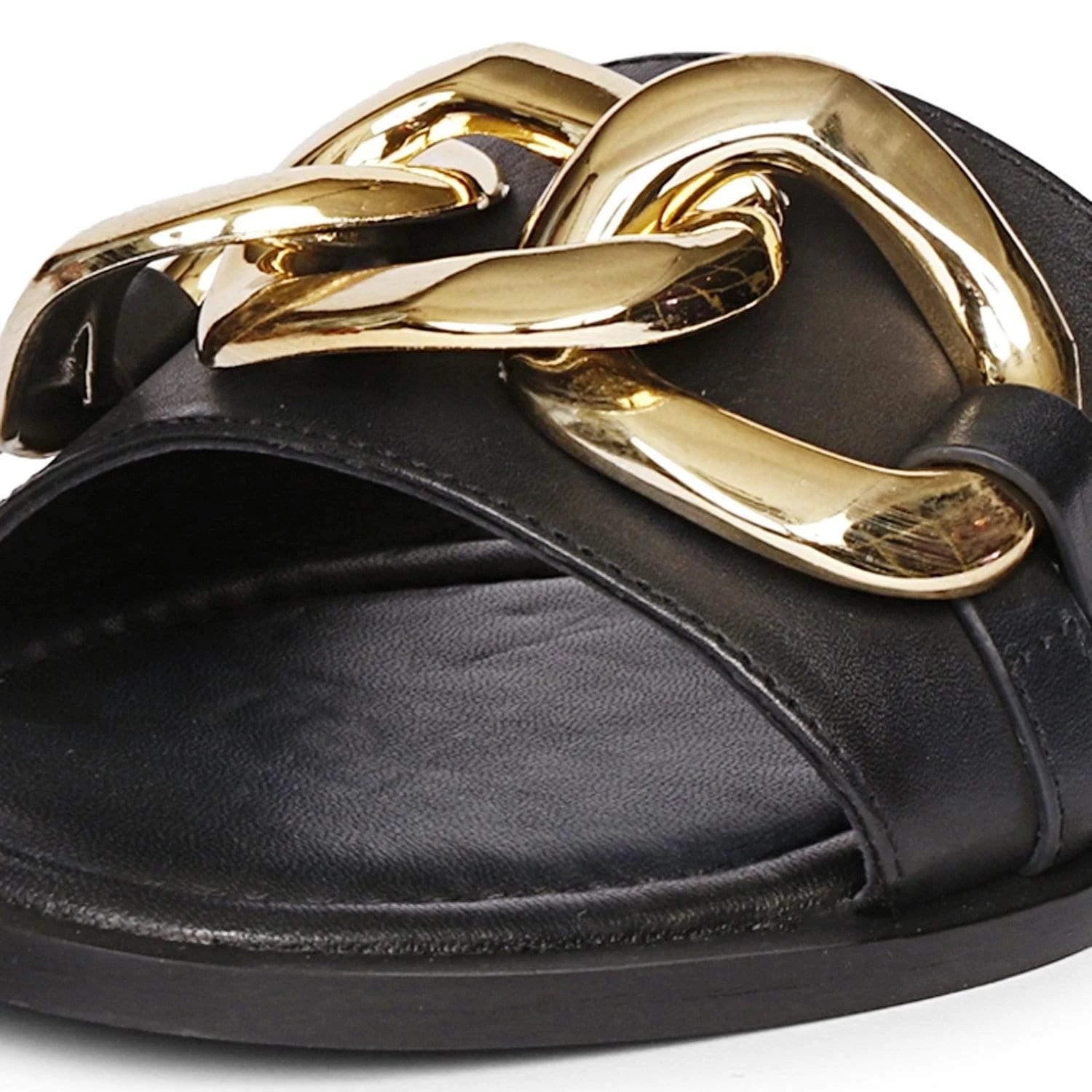 Black flat slides with wide front strap accented with gold metallic chain trim. Crafted from genuine leather upper, cuoio leather lining, and black tunit sole with a premium finishing and designed to fit. saint g gold logo embossed at leather footbed.These trim embellished slides not only look good but also are gentle on your feet, a true manifestation of high standards of workmanship with the use of the latest technology.