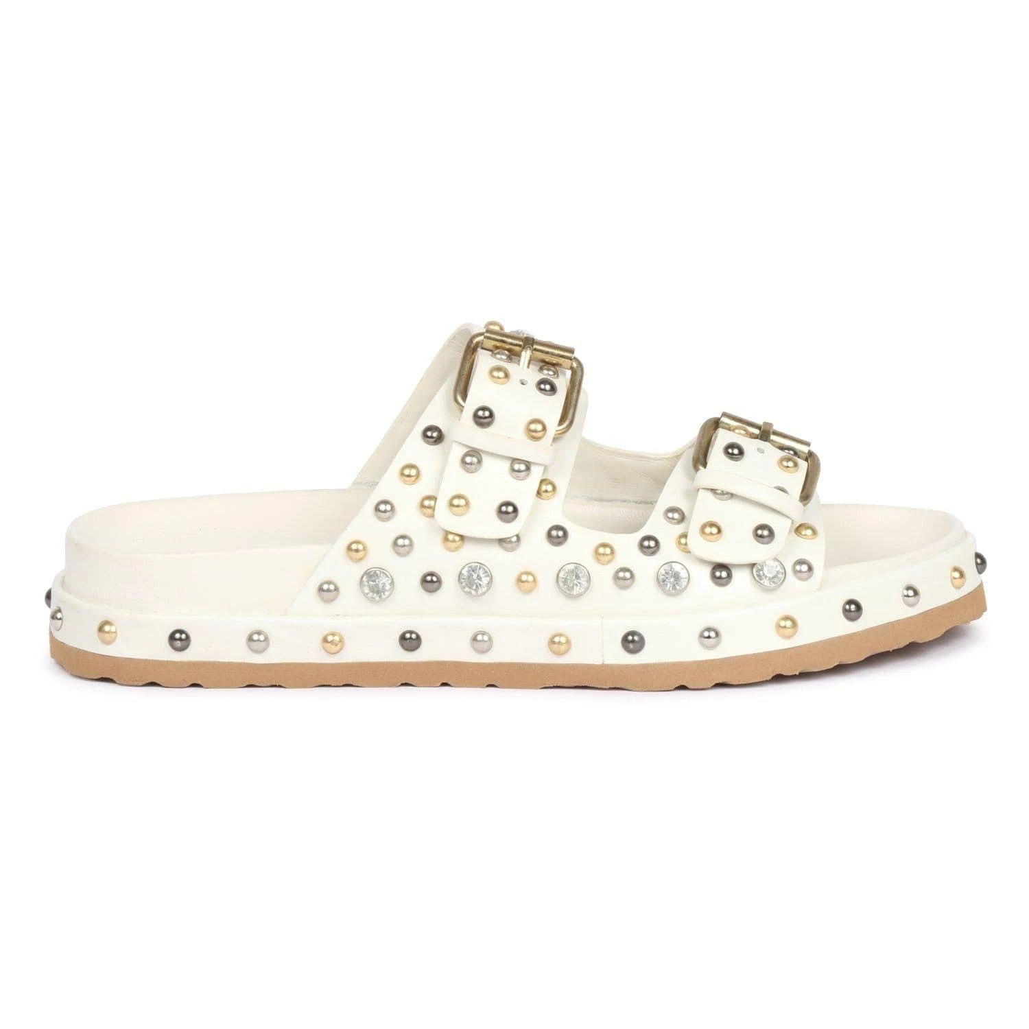 Super-comfortable handcrafted Chloe Suede Sandals with multi-stud detail. Both upper and midsole are embellished with multi studs. This double-strap slip-on sandals can be adjusted by the double buckles on top to find the most comfortable position, leather lining, rubber sole, and padded leather foot bed allow you to wear the latest styles in lasting comfort.This open toe makes up the rest of the must have styles. Can either be styled with a formal or casual dress for your next event. Made perfectly with the finest material and quality products.
