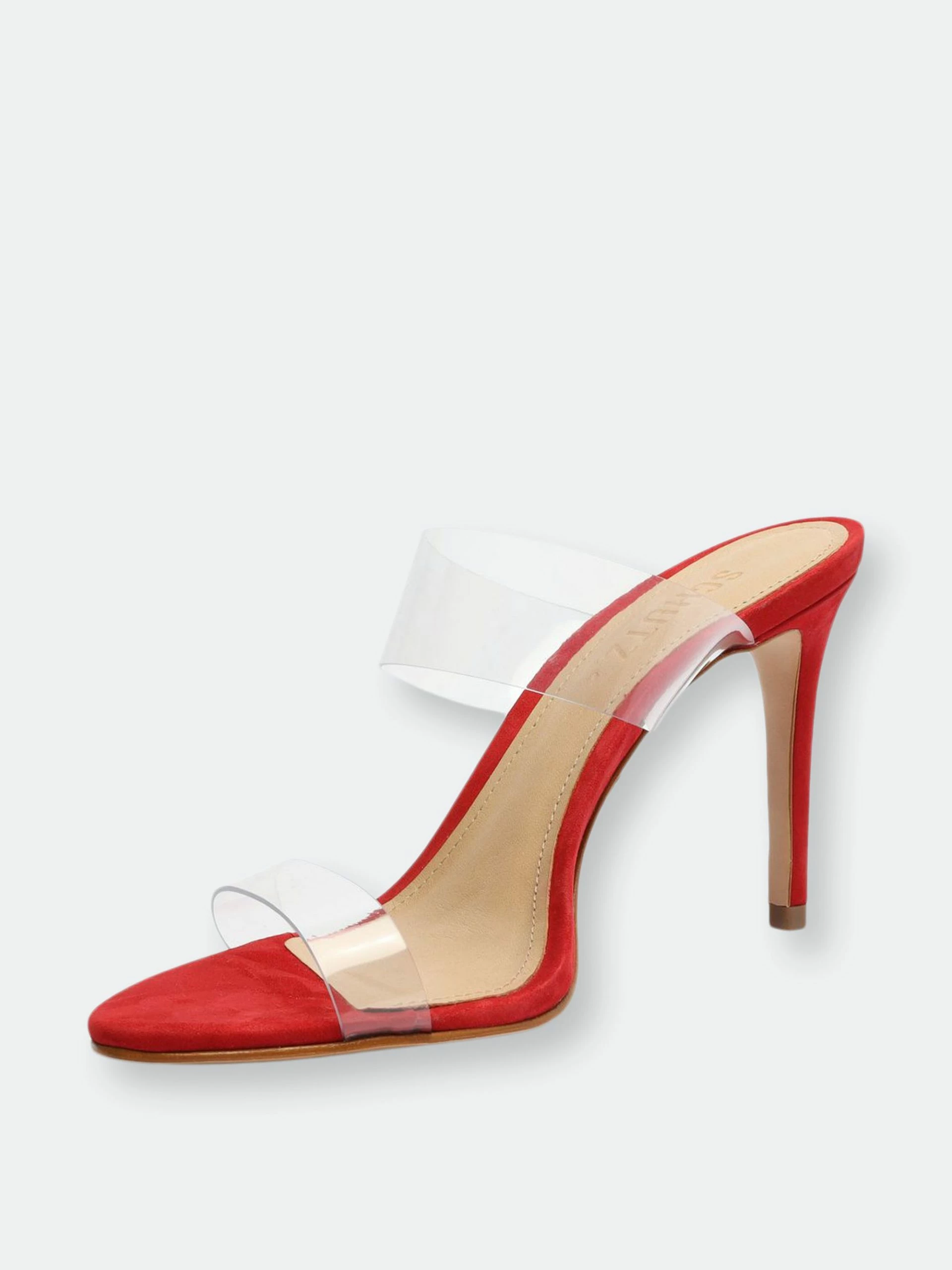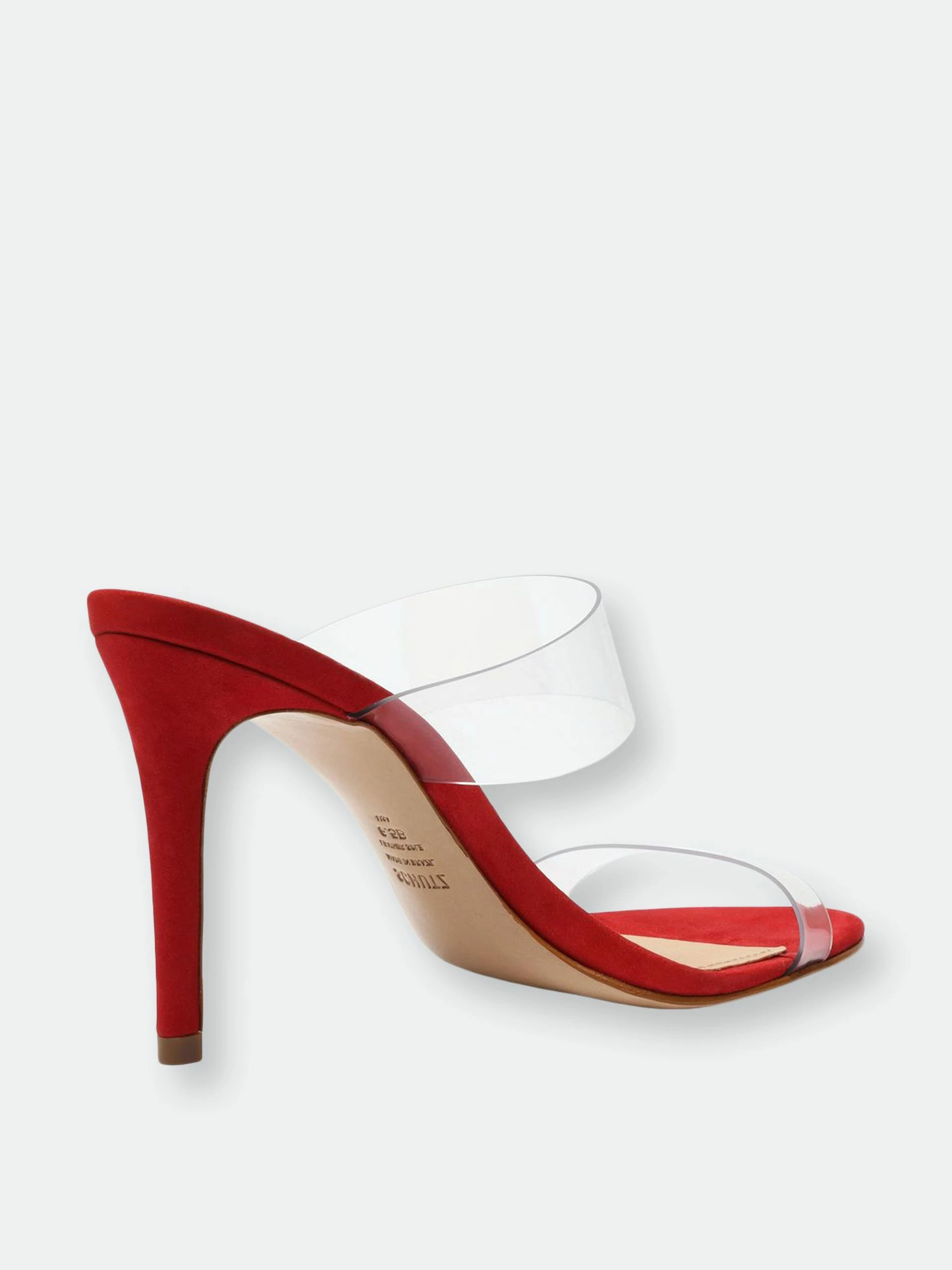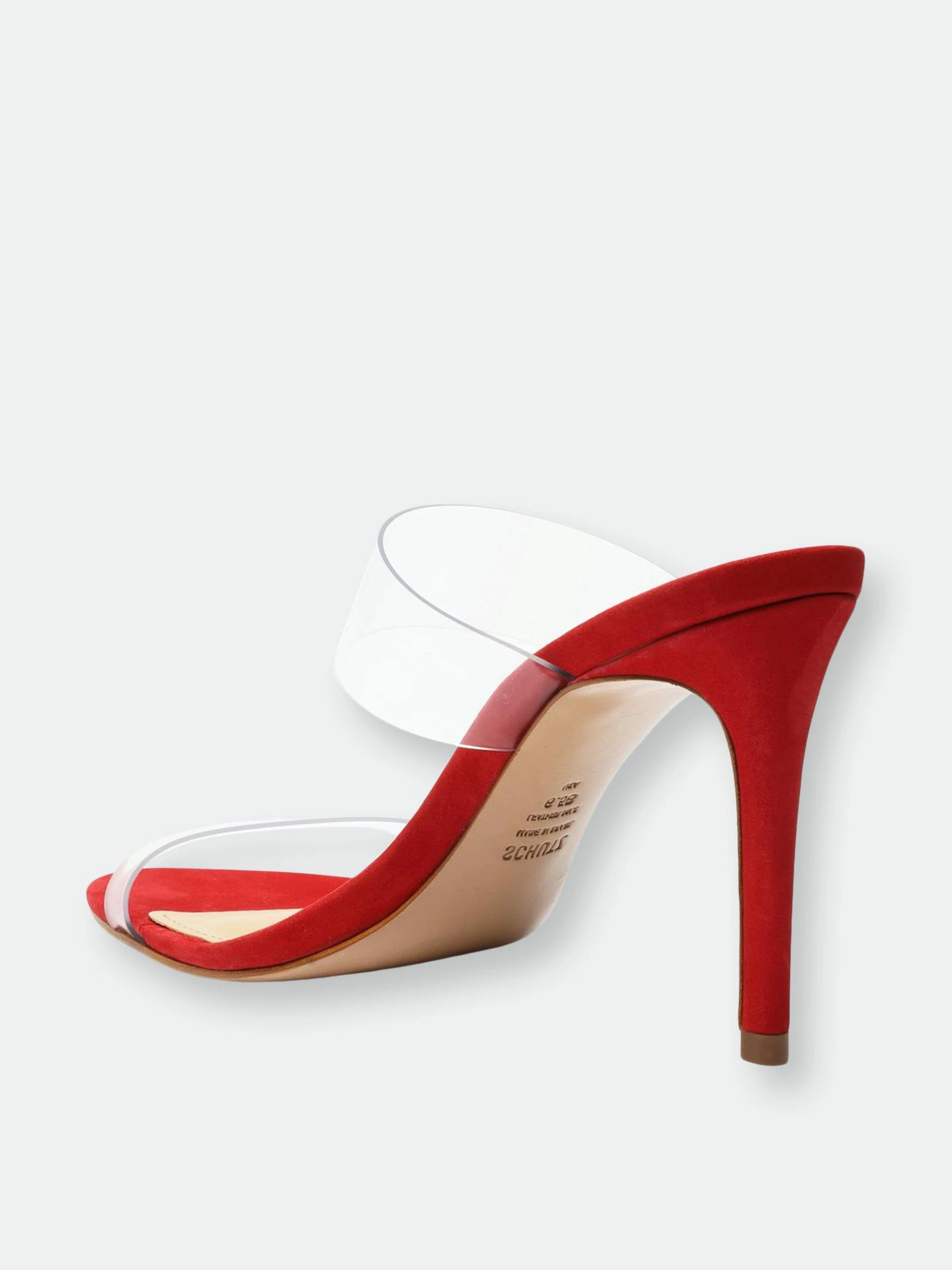 Material: Nubuck Suede & Vinyl Clear Straps. Heel Height: 4 in | 100 mm. Fit: This style runs narrow. We suggest ordering a half size bigger than normal.. PVC strap with elastic inset. Slide sandals. Stiletto heel. Open toe. Leather sole.