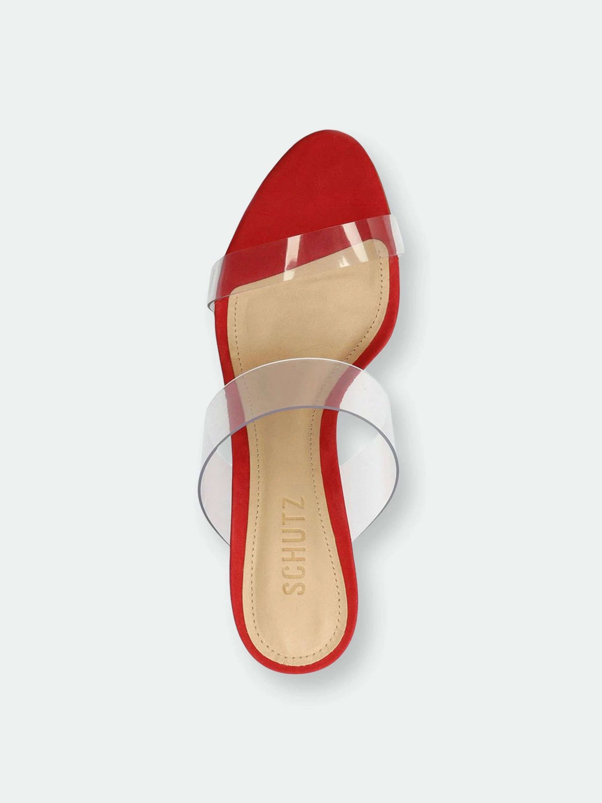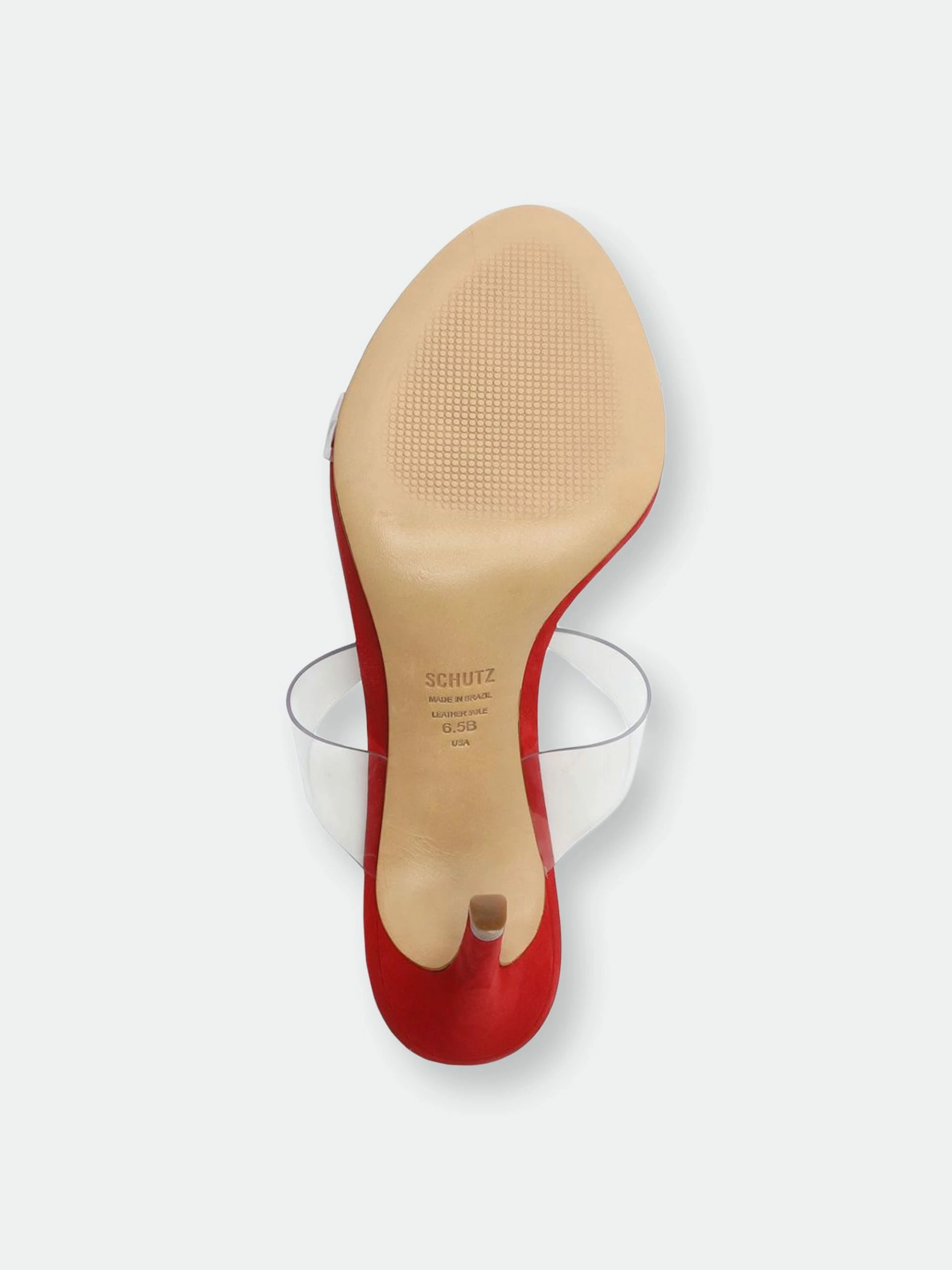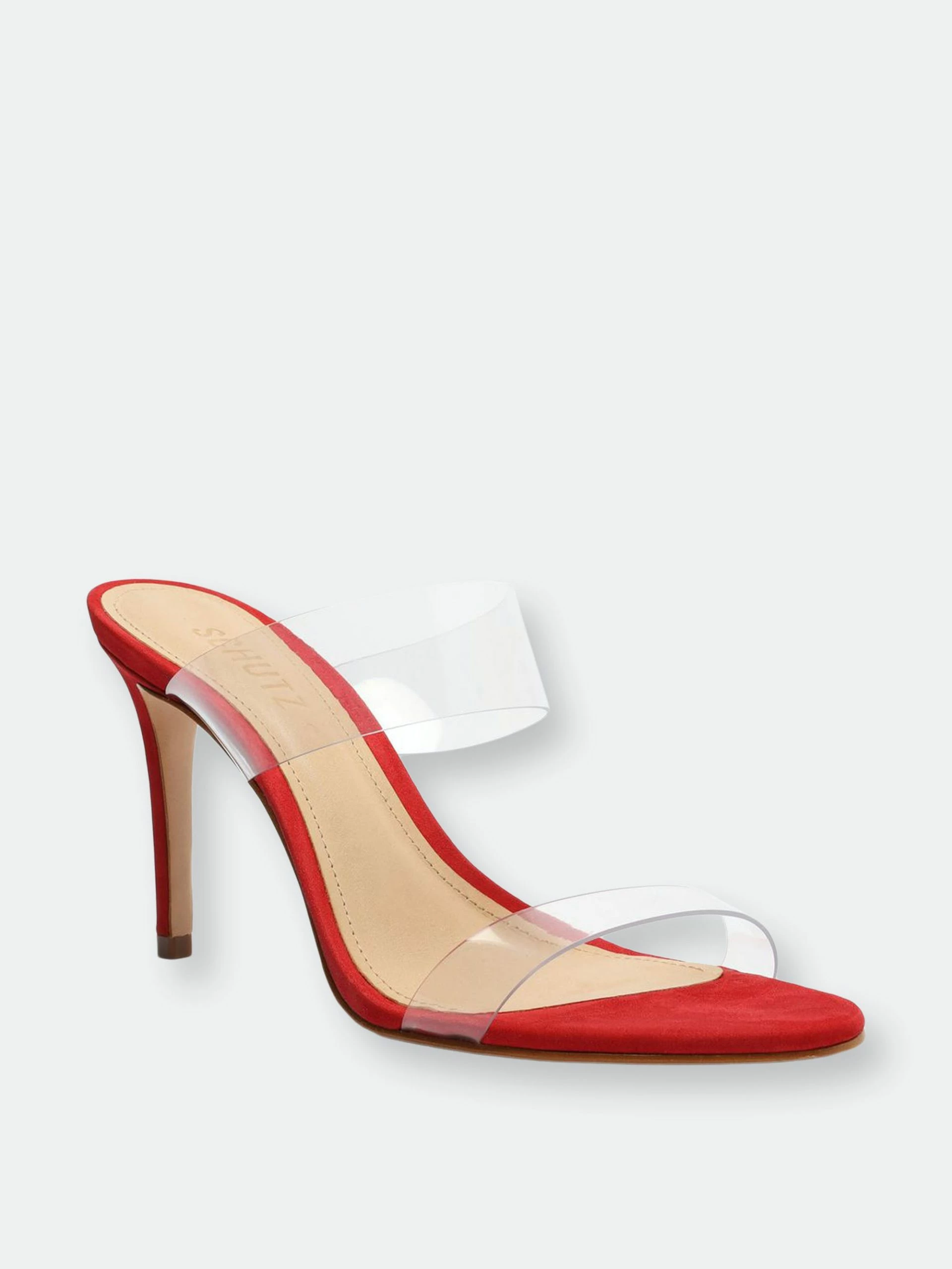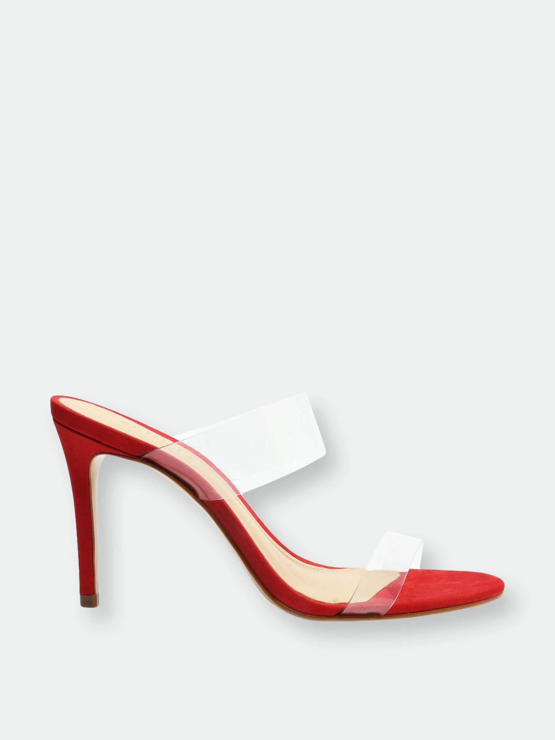 Material: Nubuck Suede & Vinyl Clear Straps. Heel Height: 4 in | 100 mm. Fit: This style runs narrow. We suggest ordering a half size bigger than normal.. PVC strap with elastic inset. Slide sandals. Stiletto heel. Open toe. Leather sole.