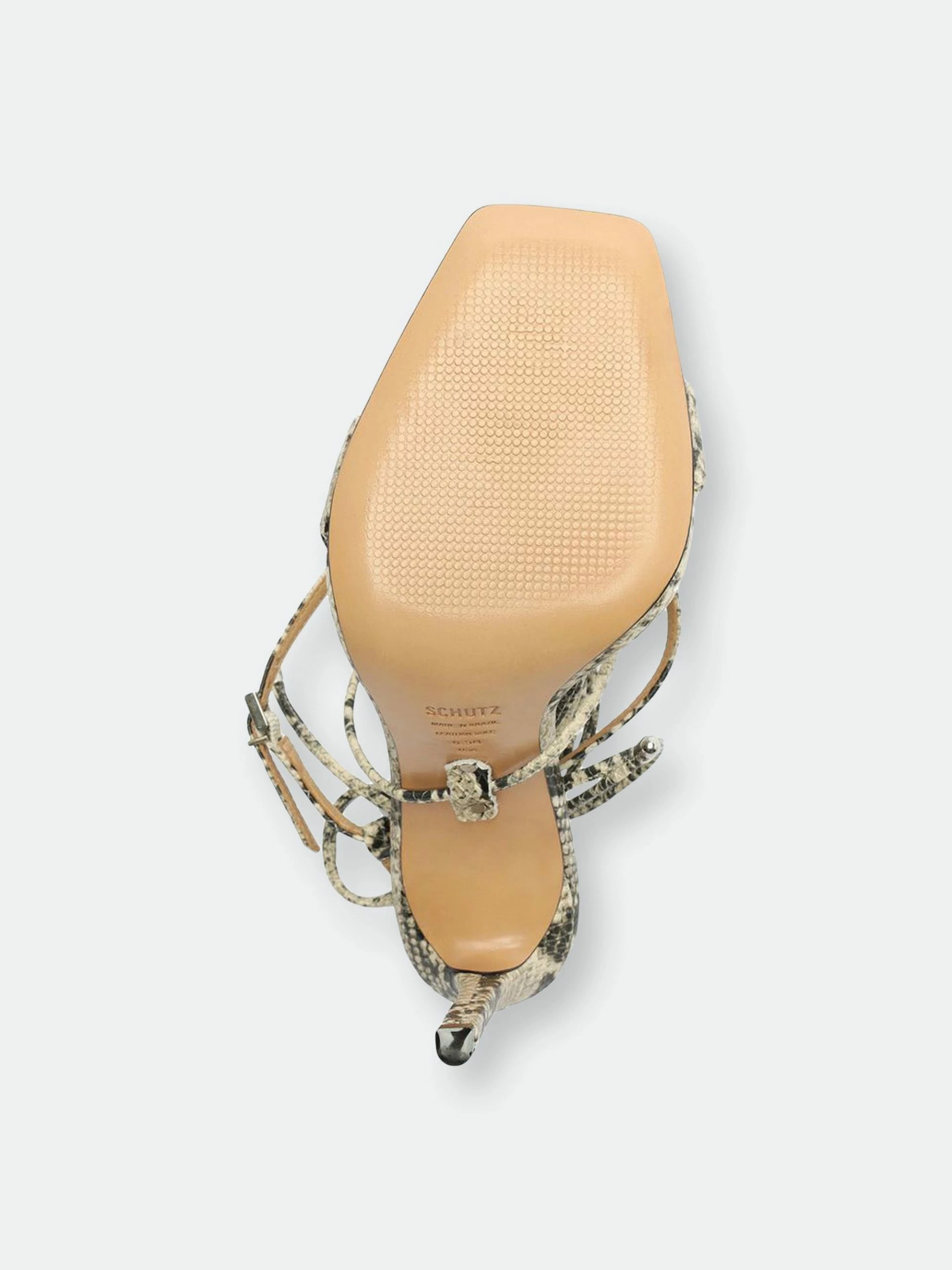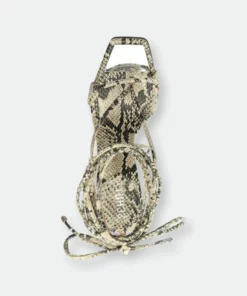 Up, up and away. Reach new style heights in the Vikki Snake-Embossed Leather Sandal. This stiletto-heeled style is crafted from snake-embossed leather with a square-shaped toe and ankle-wrap detailing.