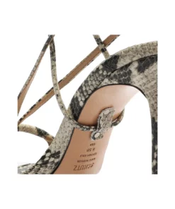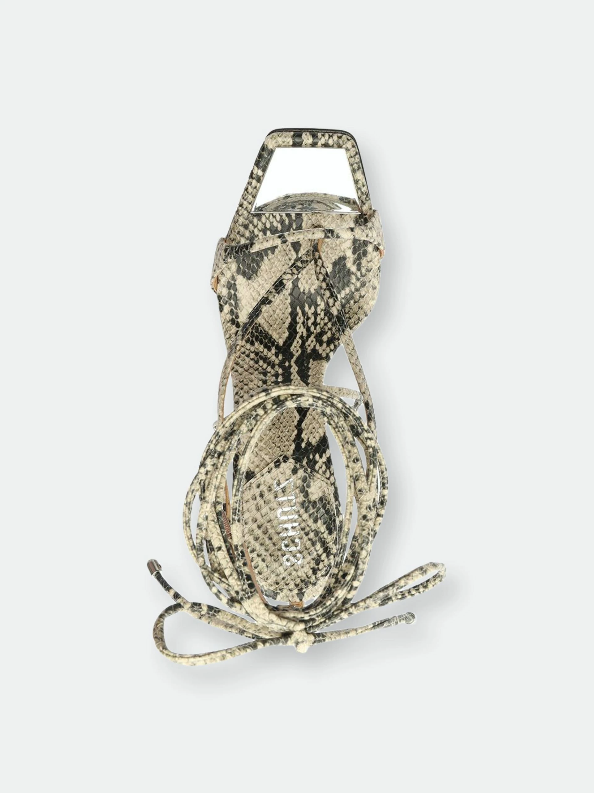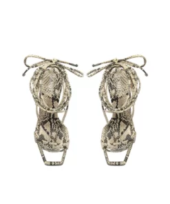 Material: Snake-Embossed Leather. Leather insole. Rubber heel patch at leather sole. Lace-up strap at the ankle. Squared toe with a golden detail. Stiletto heel. Heel Height: 3.9 in | 100 mm.