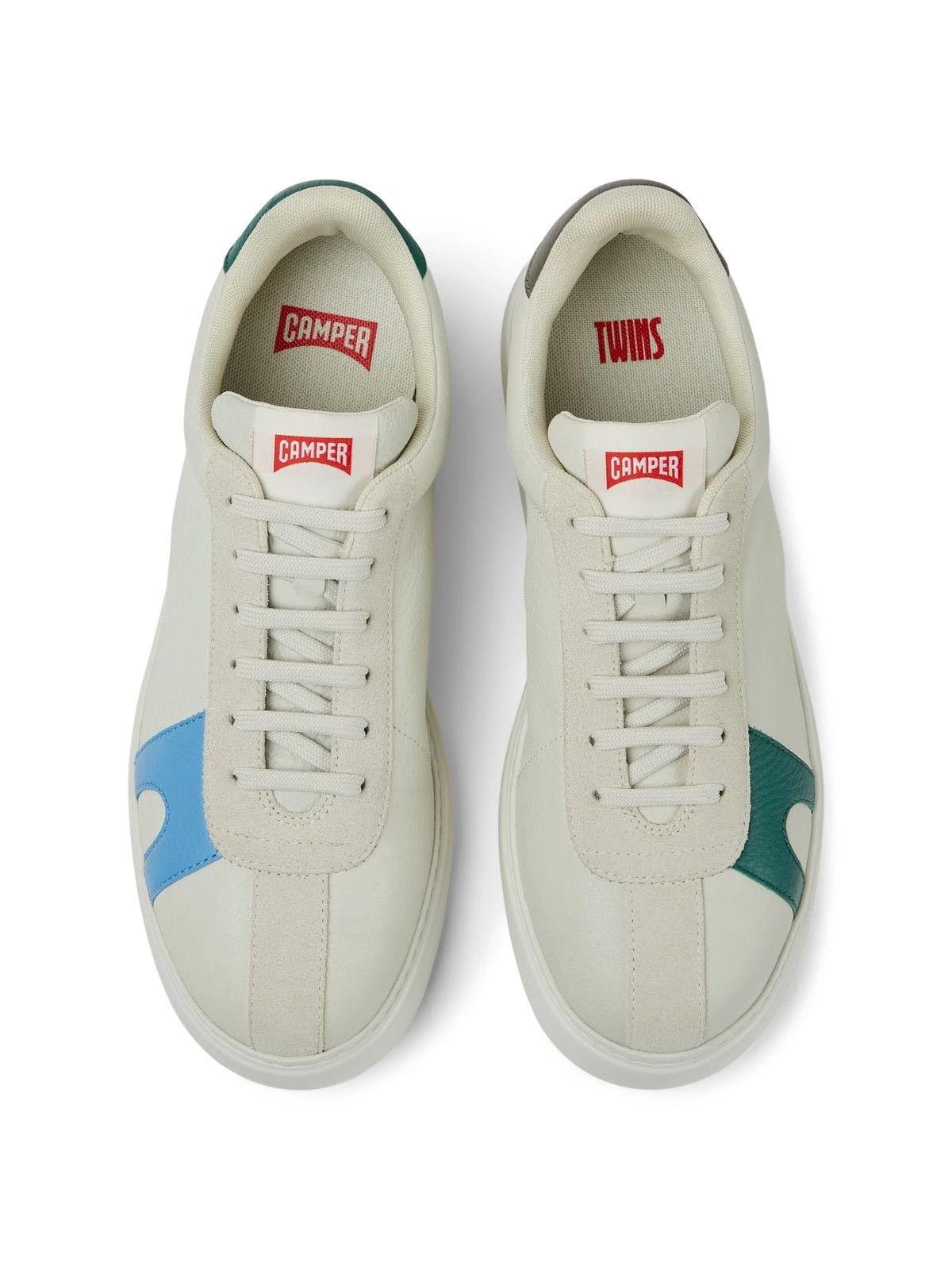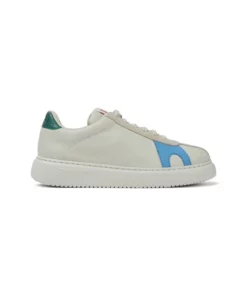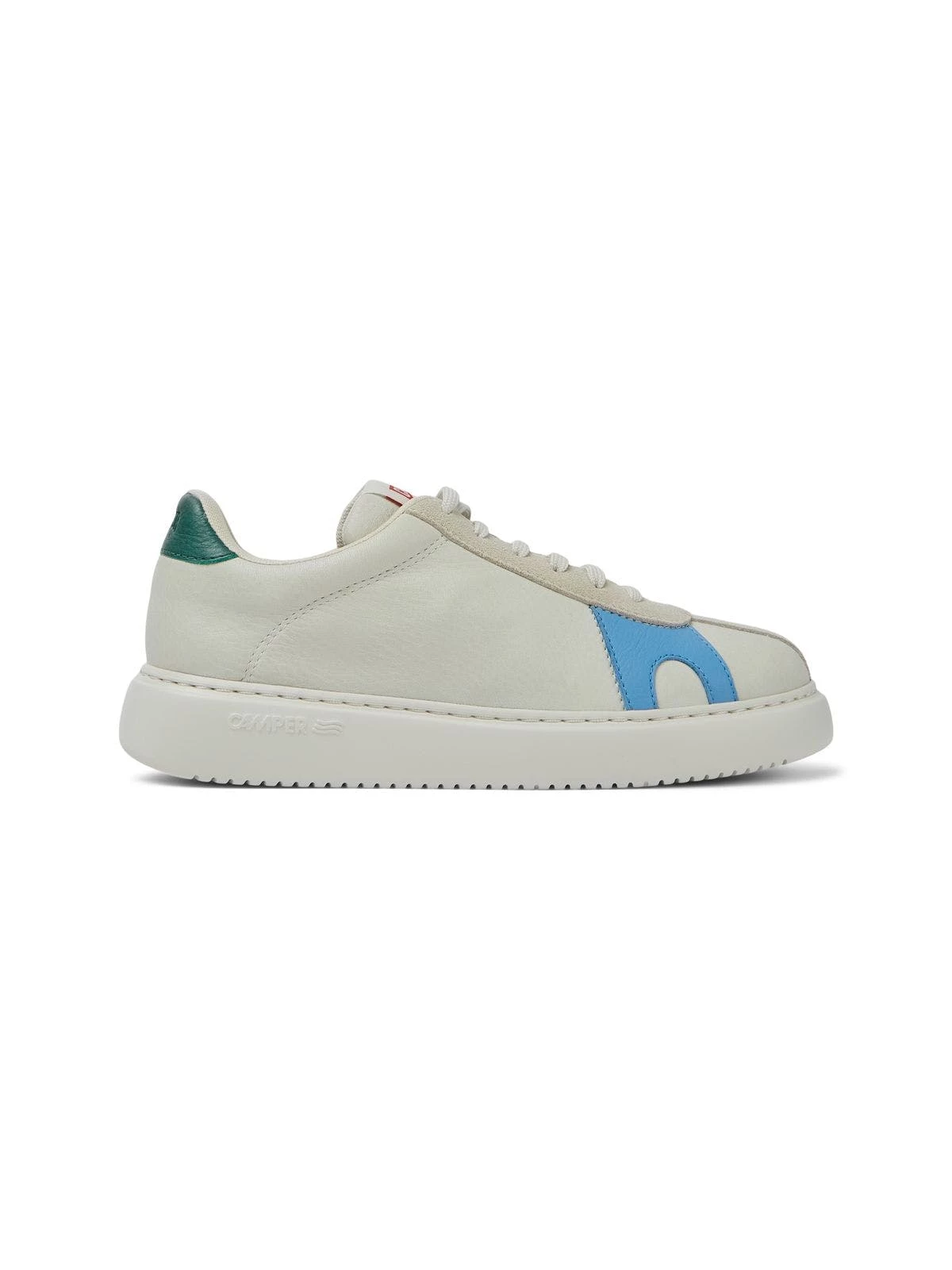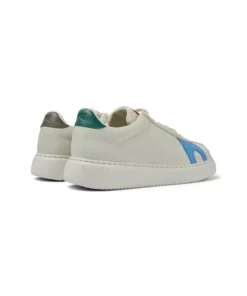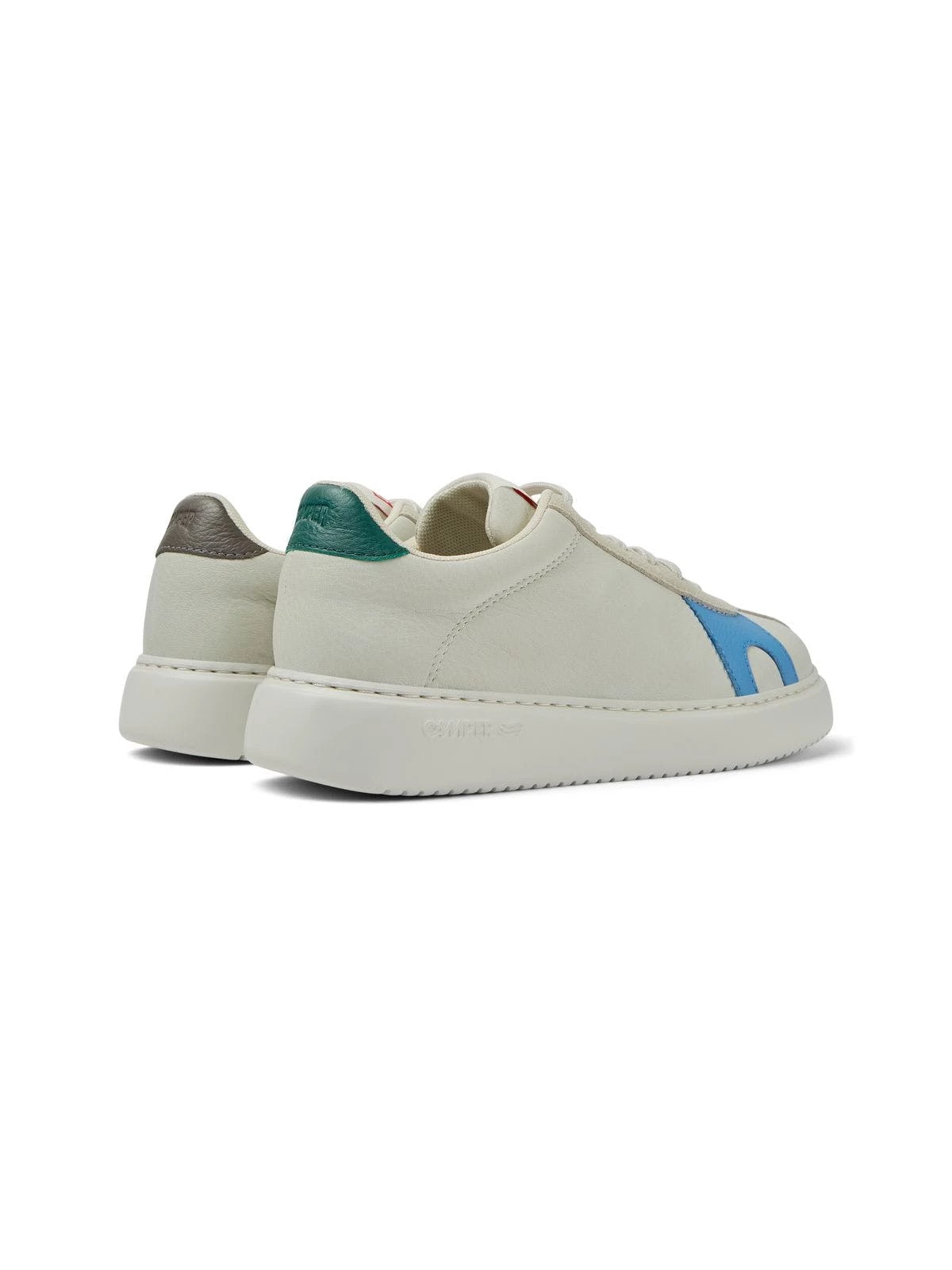 White non-dyed leather and nubuck women’s sneakers with colorful details, OrthoLite Recycled footbeds, and XL Extralight Organix outsoles (30% bio-based sugarcane).