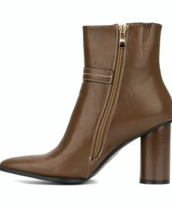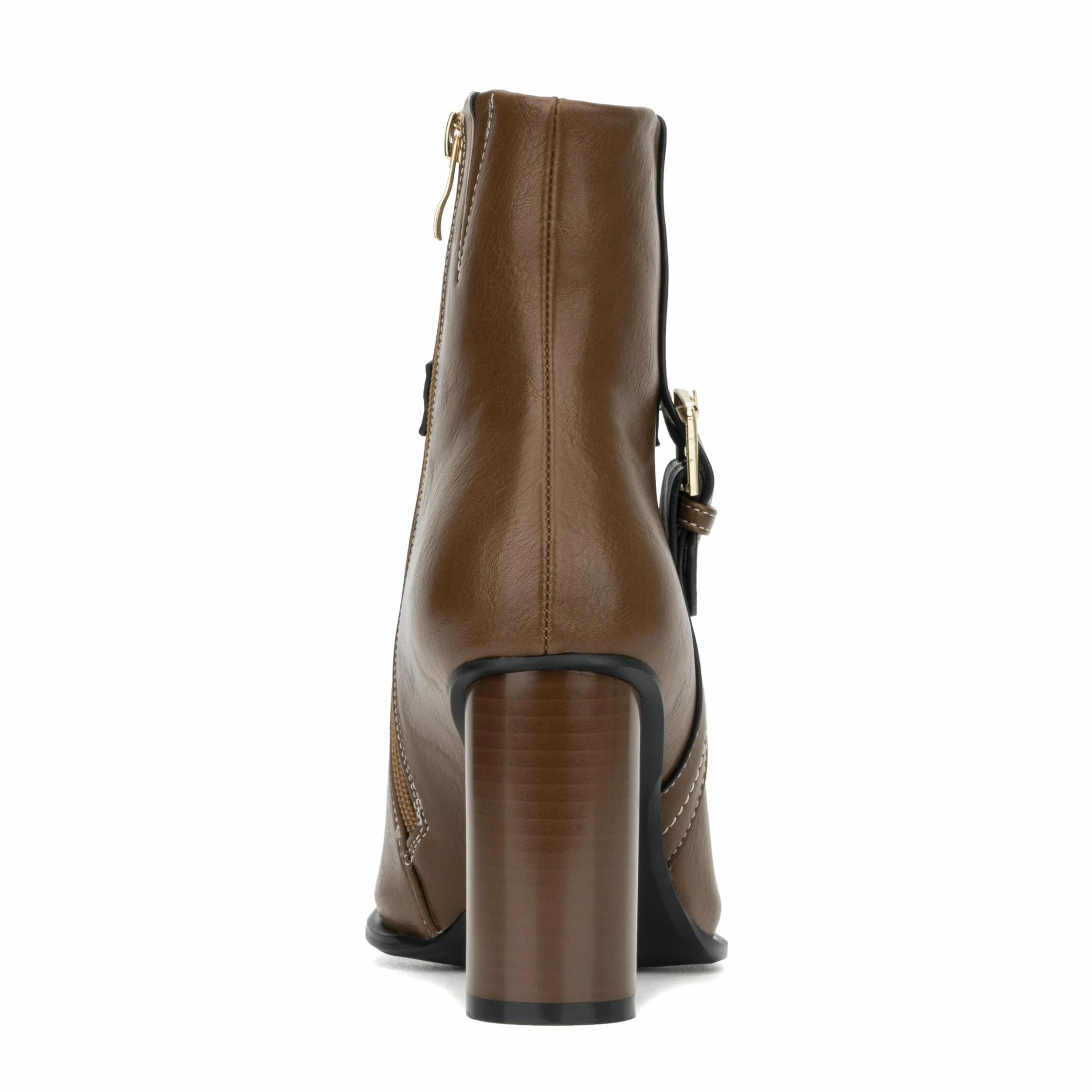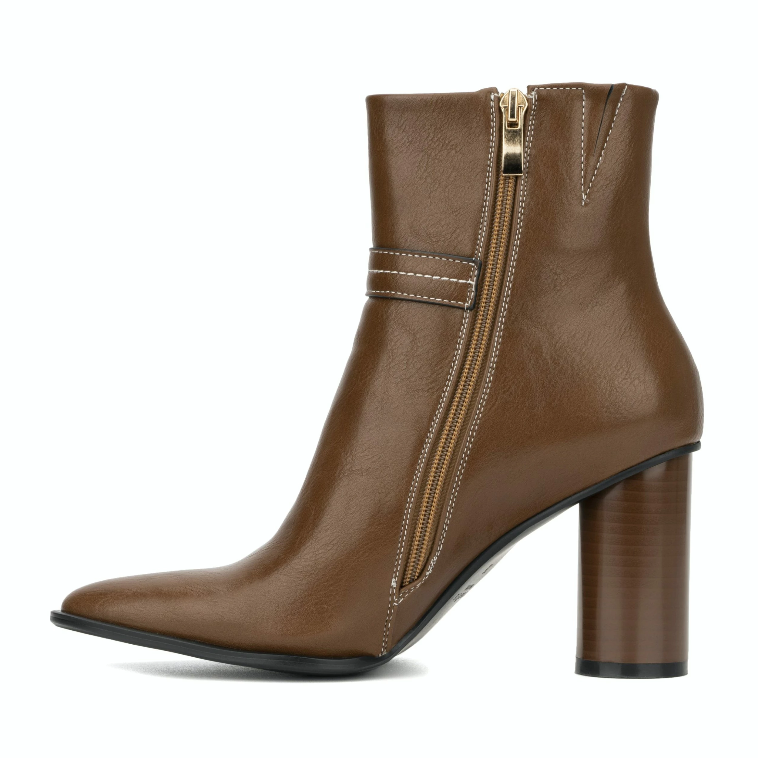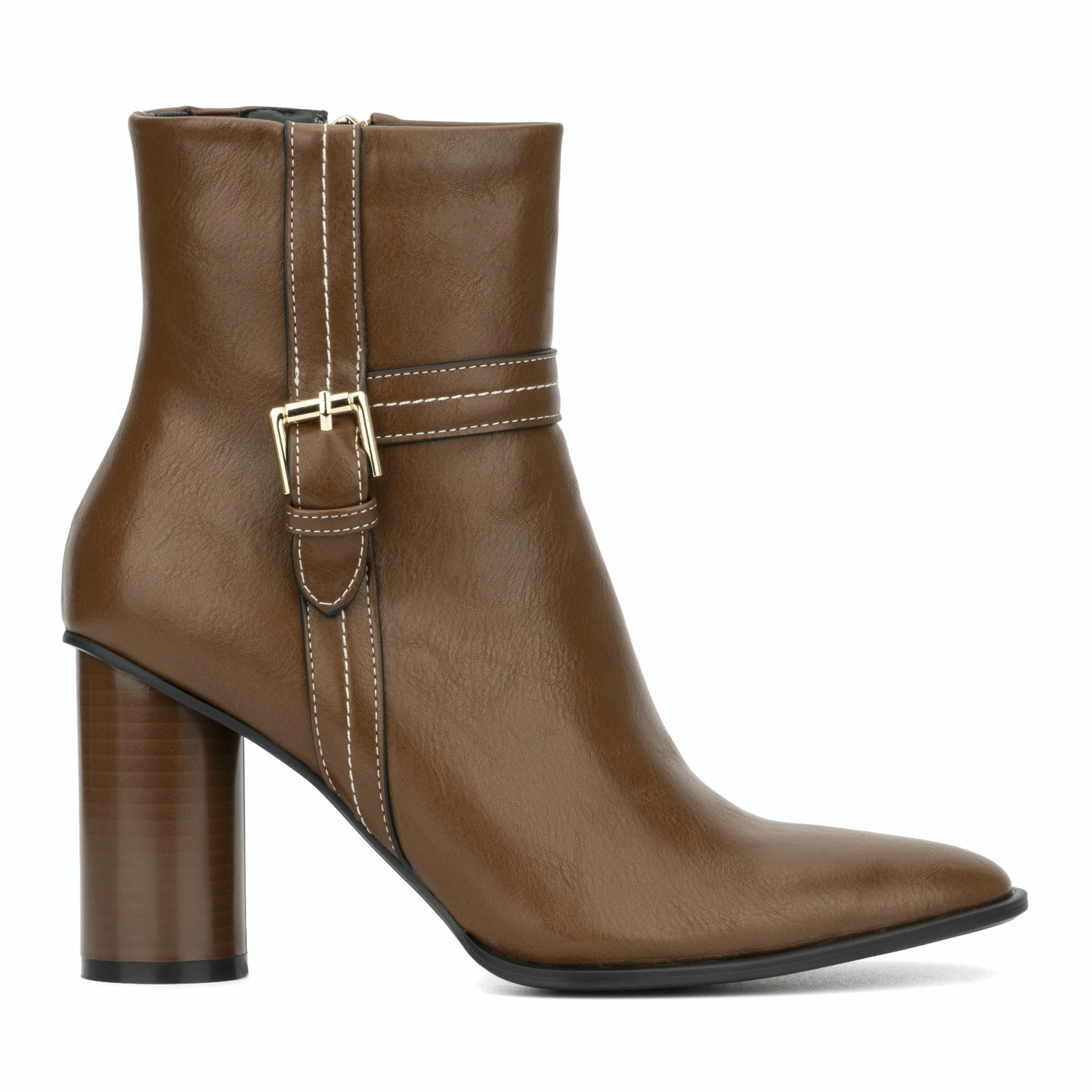 The London boot features a chunky heel, side zipper, pointed toe and a buckle décor. Perfectly paired with jeans, dress or skirt for a chic look.