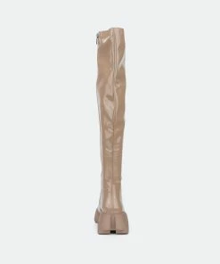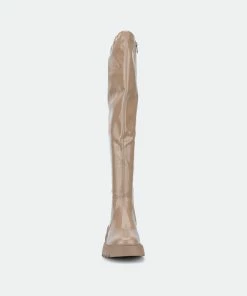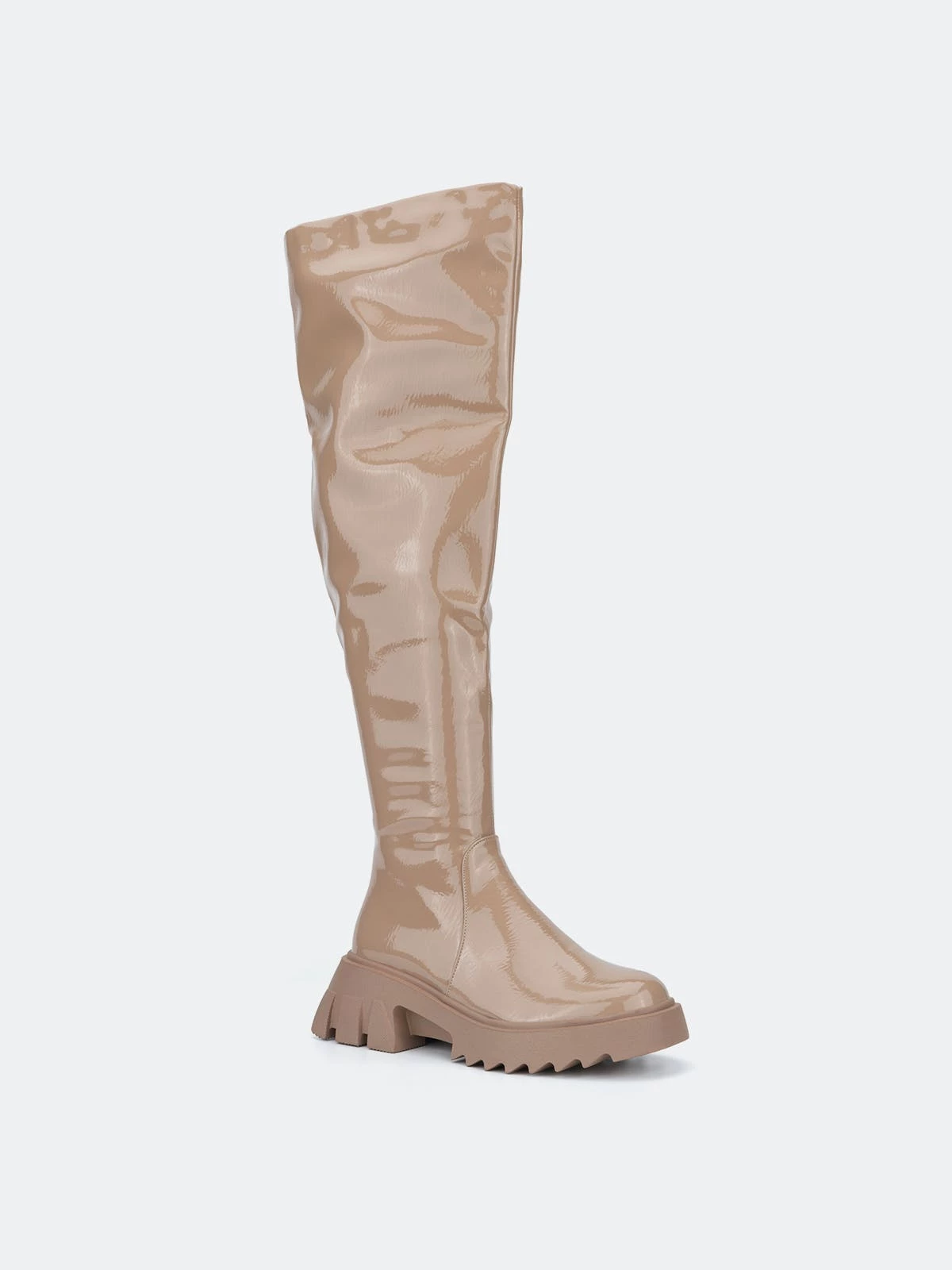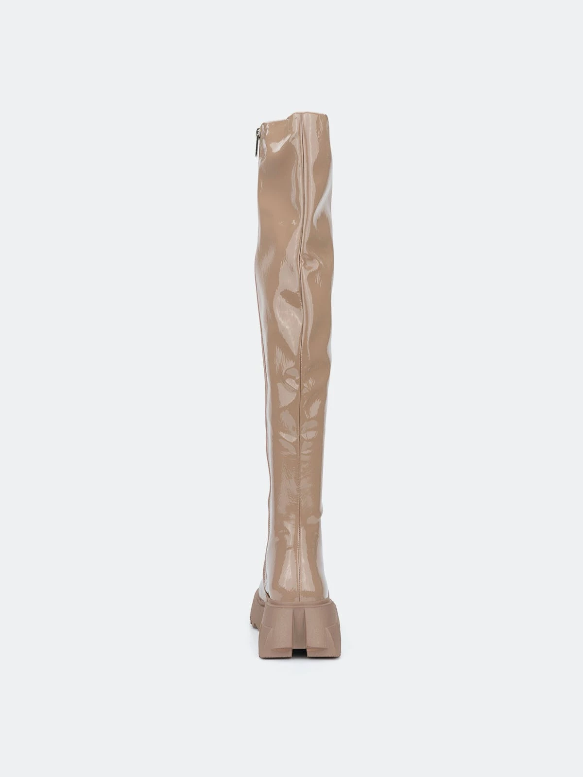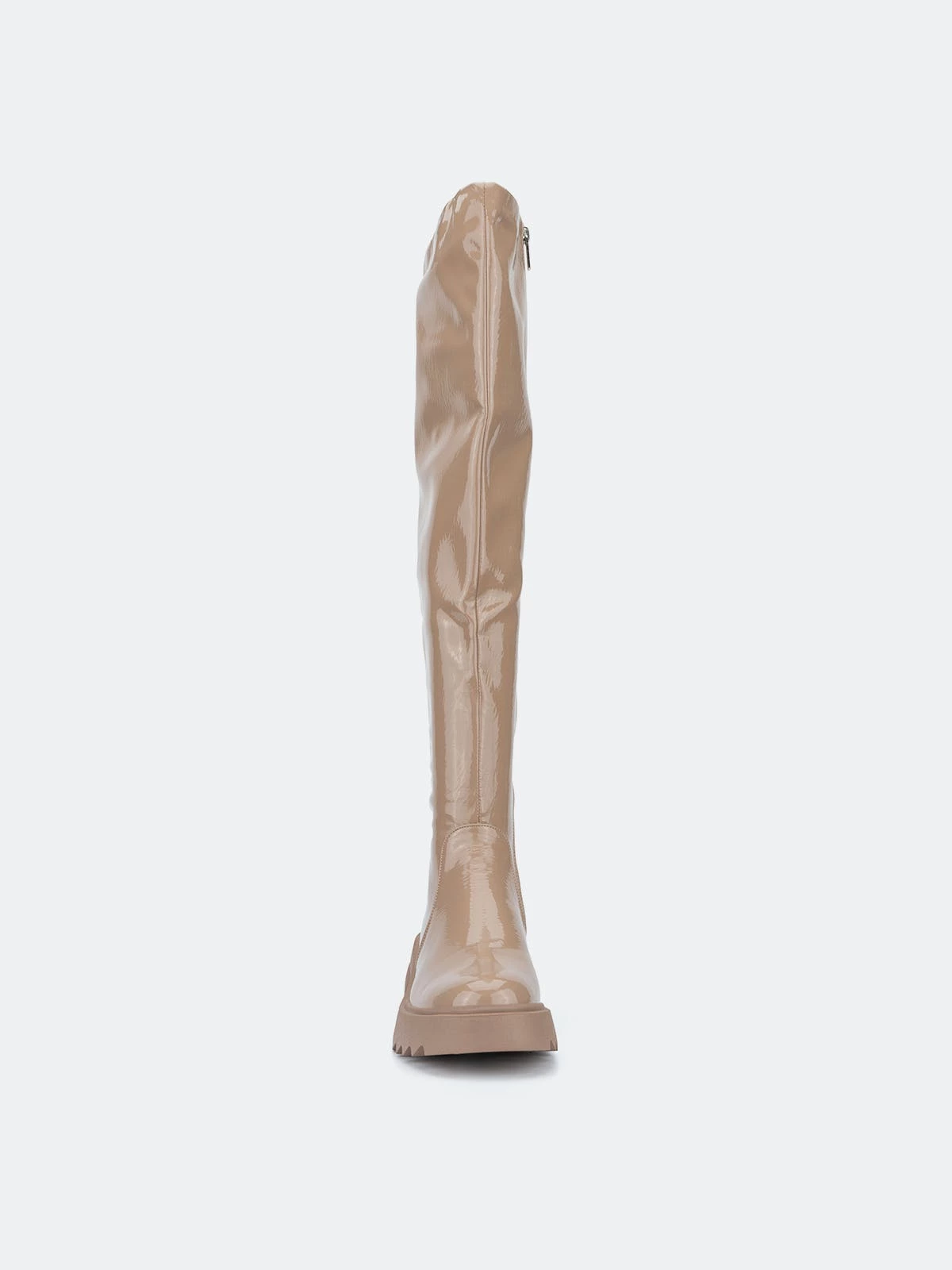 Exude confidence with a unique and bold style to match. These super-tall boots have a patent sheen, a thick lug sole and an attitude. Supple faux leather fabrication with a durable rubber sole and soft fabric lining for next-to-skin comfort.