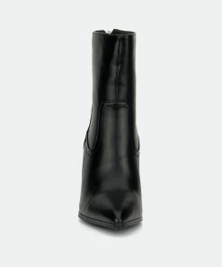 These fabulous ankle boots are stone-cold stunners. Retro spread stacked heel and witchy pointed toe. Supple faux leather fabrication with a durable rubber sole and soft fabric lining for next-to-skin comfort.