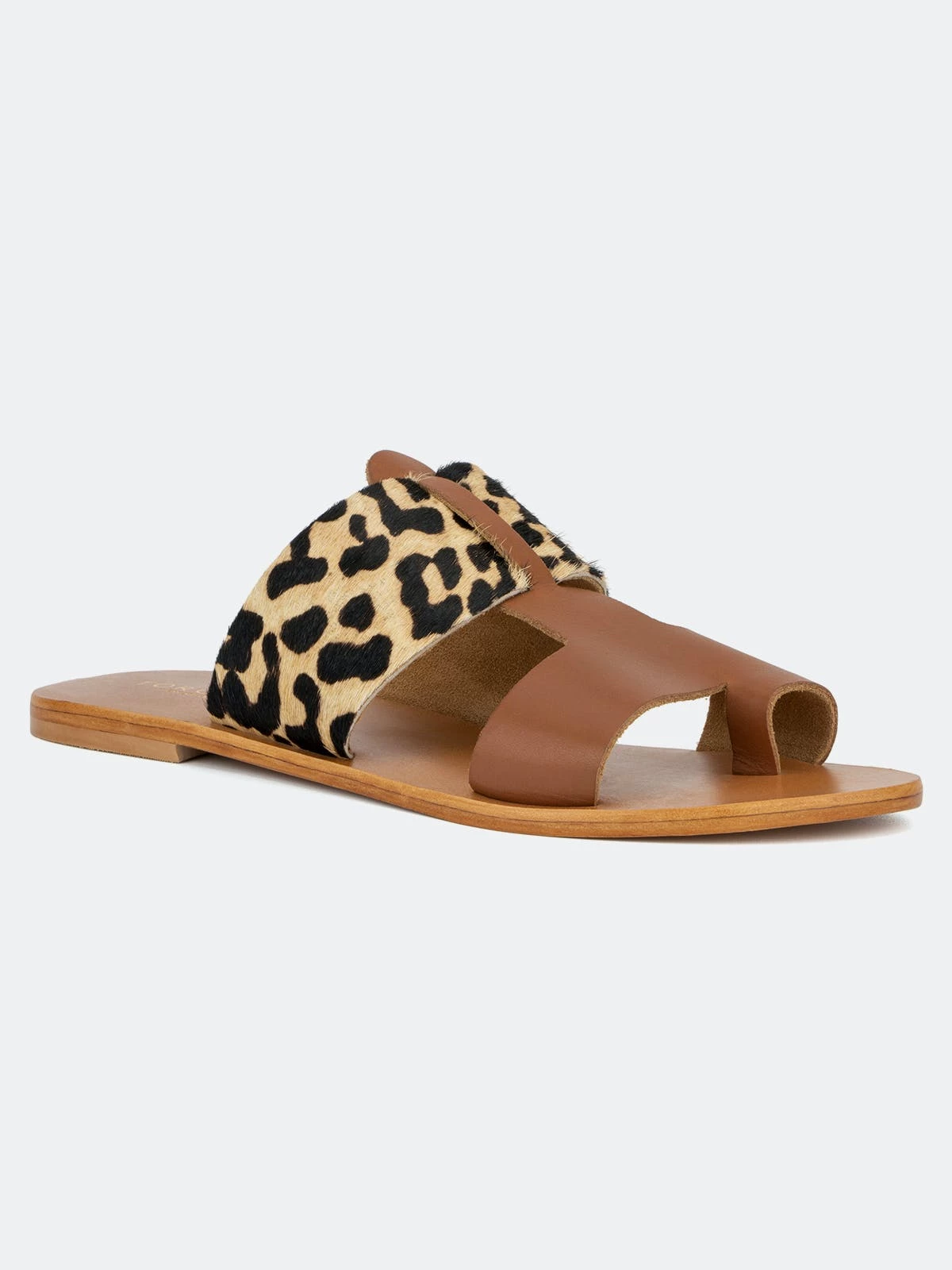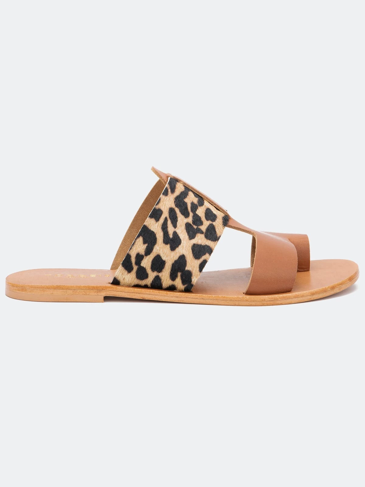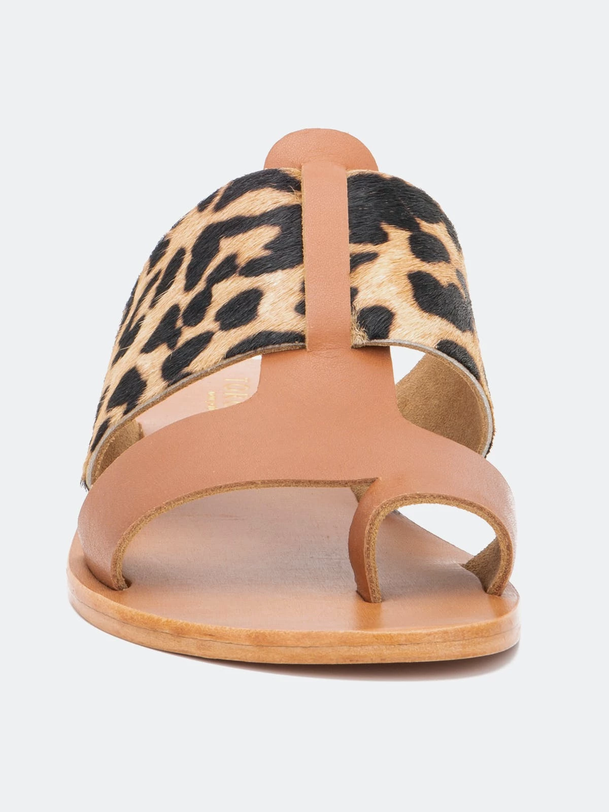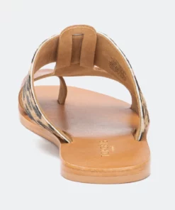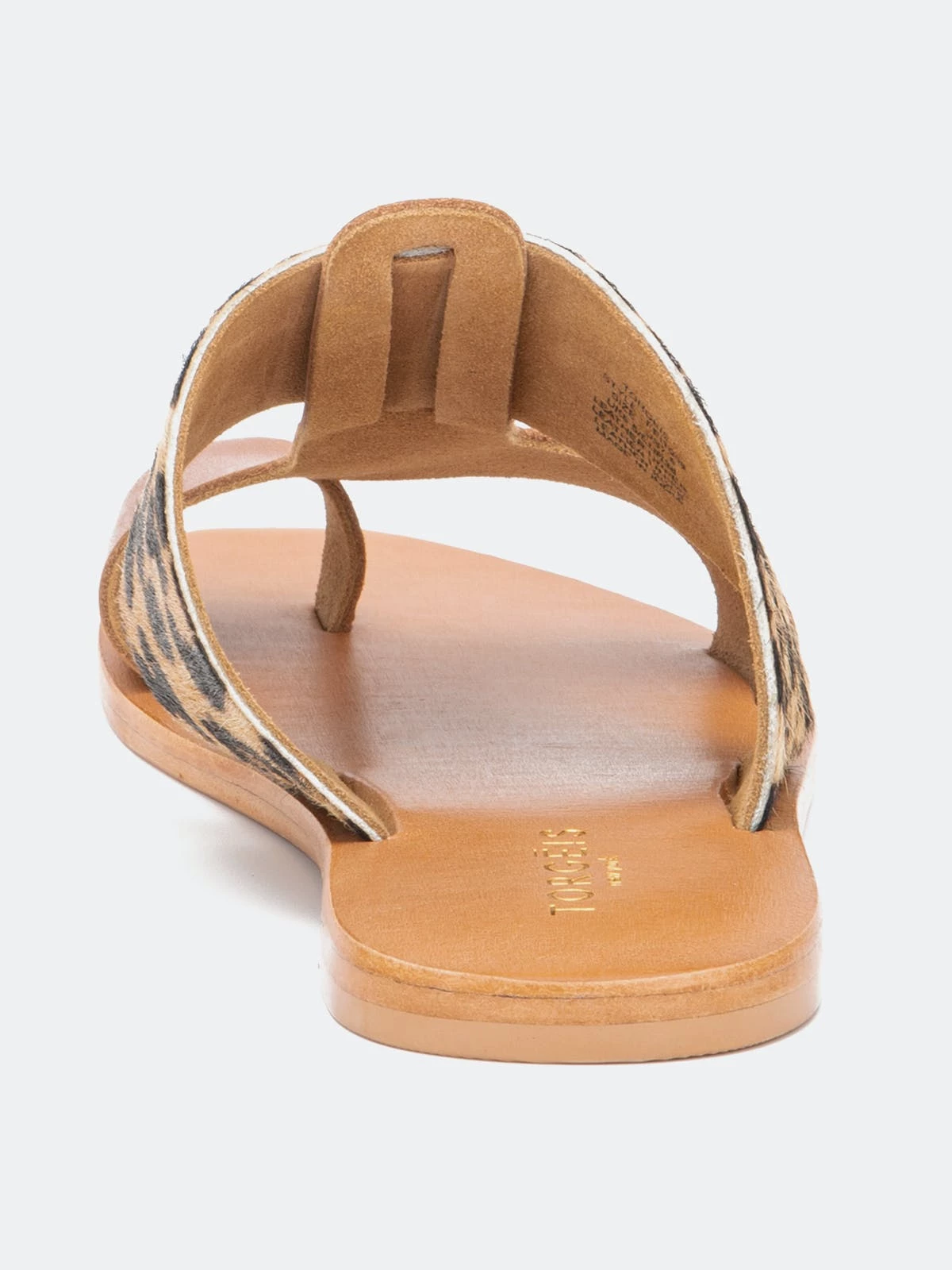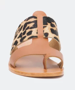 Set the tone of your next casual wardrobe with this two tone construction Epona Sandal by Torgeis. This leopard print design, mixed with a nude color way, gives this easy to slip on flat sandal a sexy flare to any casual wear.