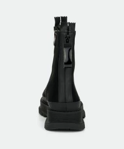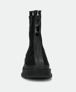 Space-age style is at your fingertips in these bold boots that are a style setter’s dream. A tall profile with a thick platform sole is accented with a zip front with unfinished edging, back pull detail, the back zipper is non-functioning and paneled design. Soft faux-suede leather with a durable rubber sole and a soft fabric lining.