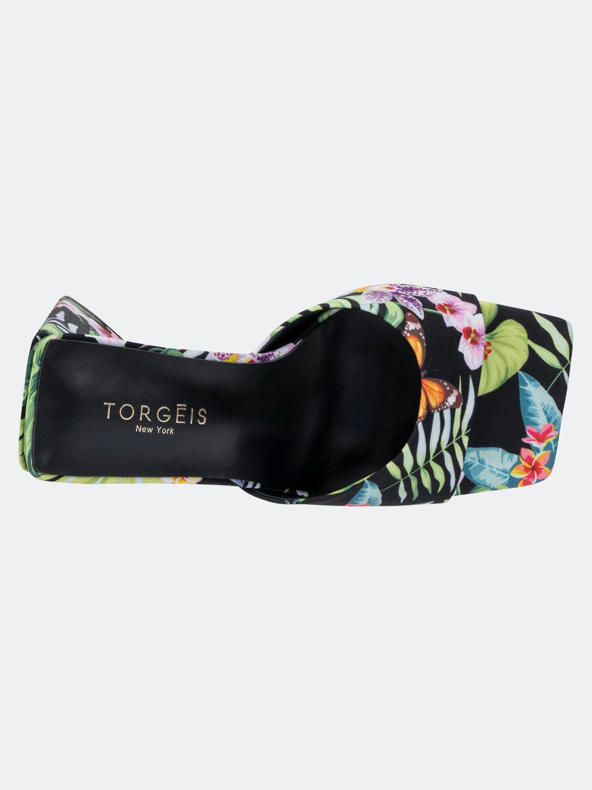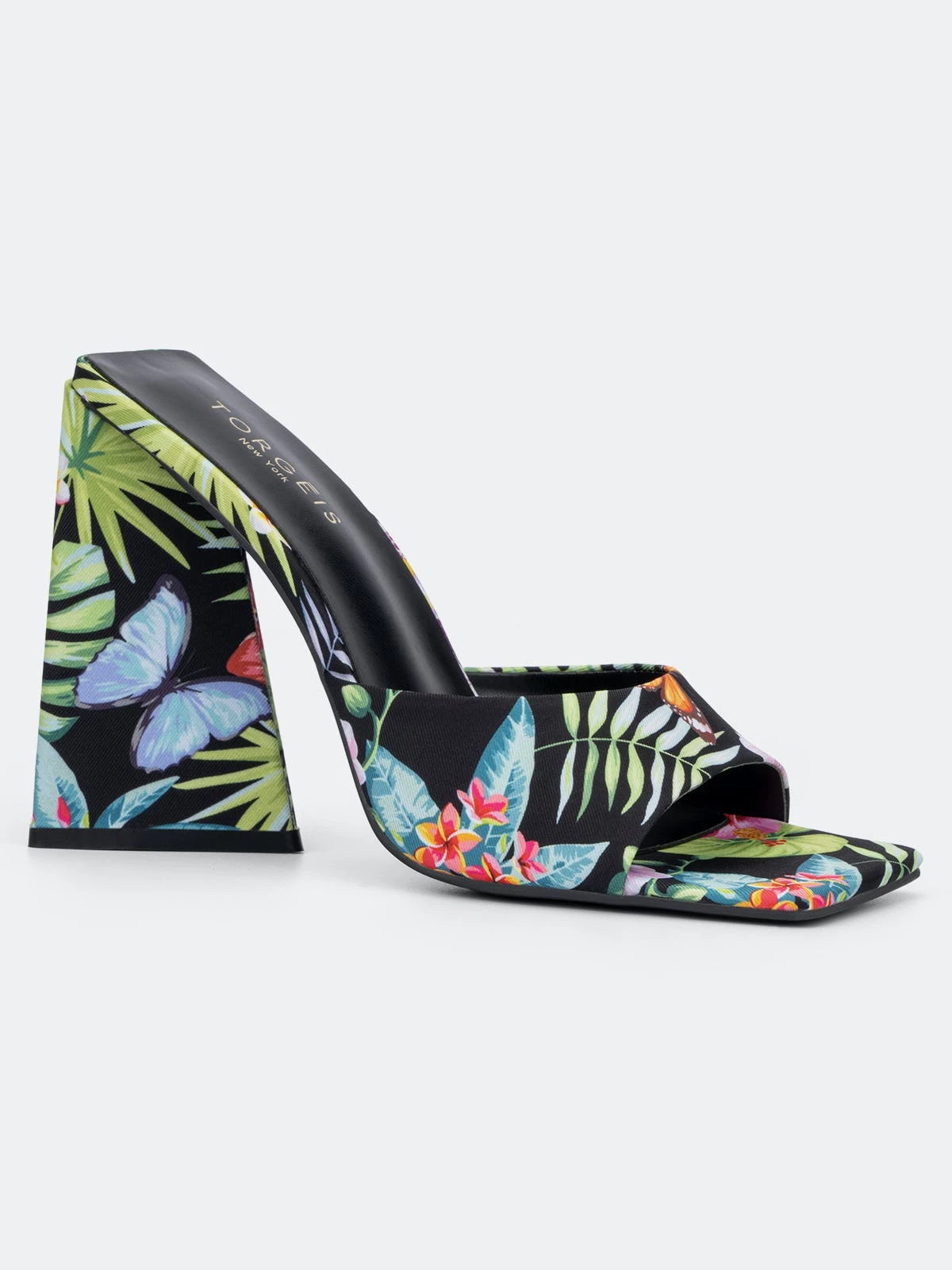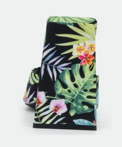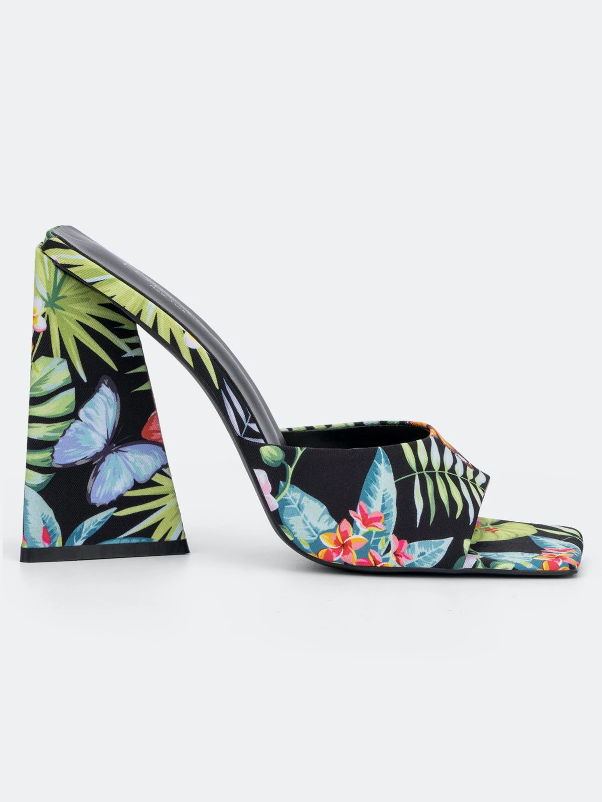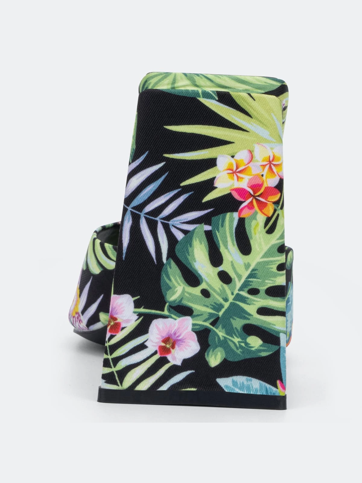 Paradise sandals for an exotic girl like you. open toe block high heels with tropical pattern. Where wild meets elegance.