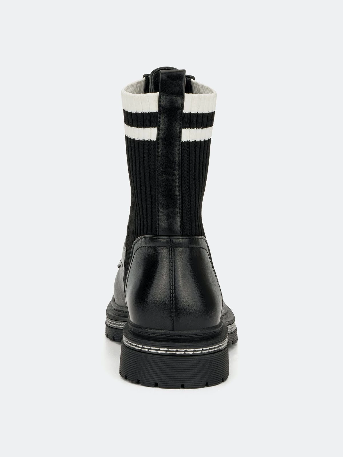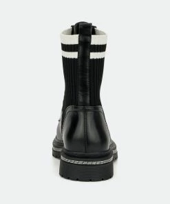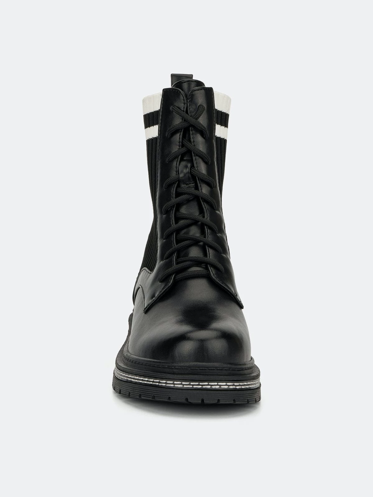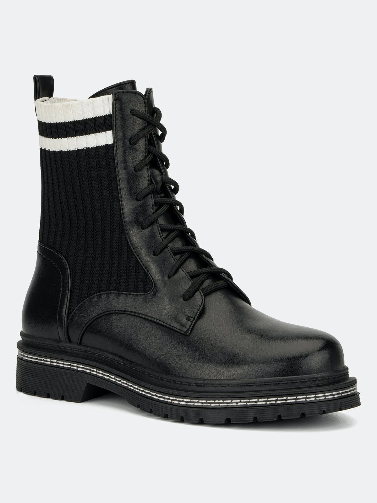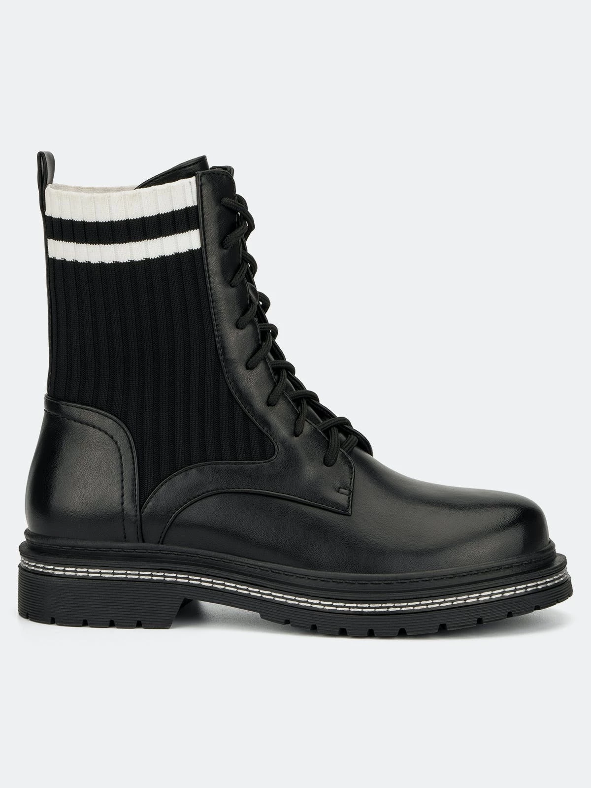 Bring a killer blend of sporty and edgy with the Skye Boot. The tall profile shows off a sports top stripe, ribbed fabric paneling, and a lace-up front. Supple faux leather fabrication with a durable rubber sole and soft fabric lining for next-to-skin comfort.