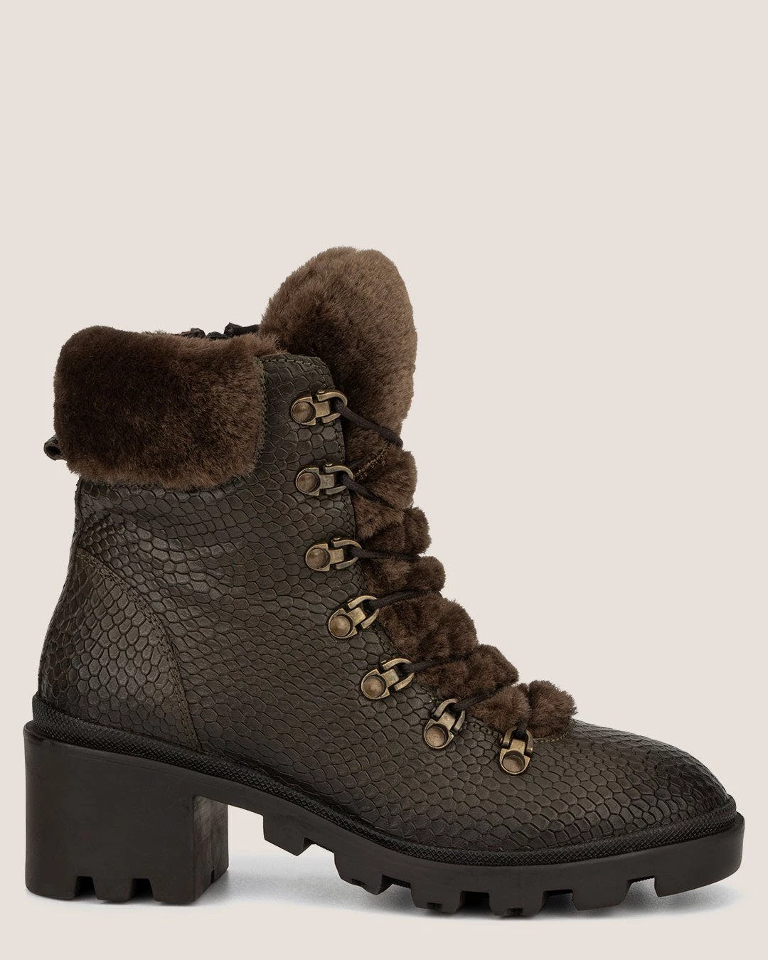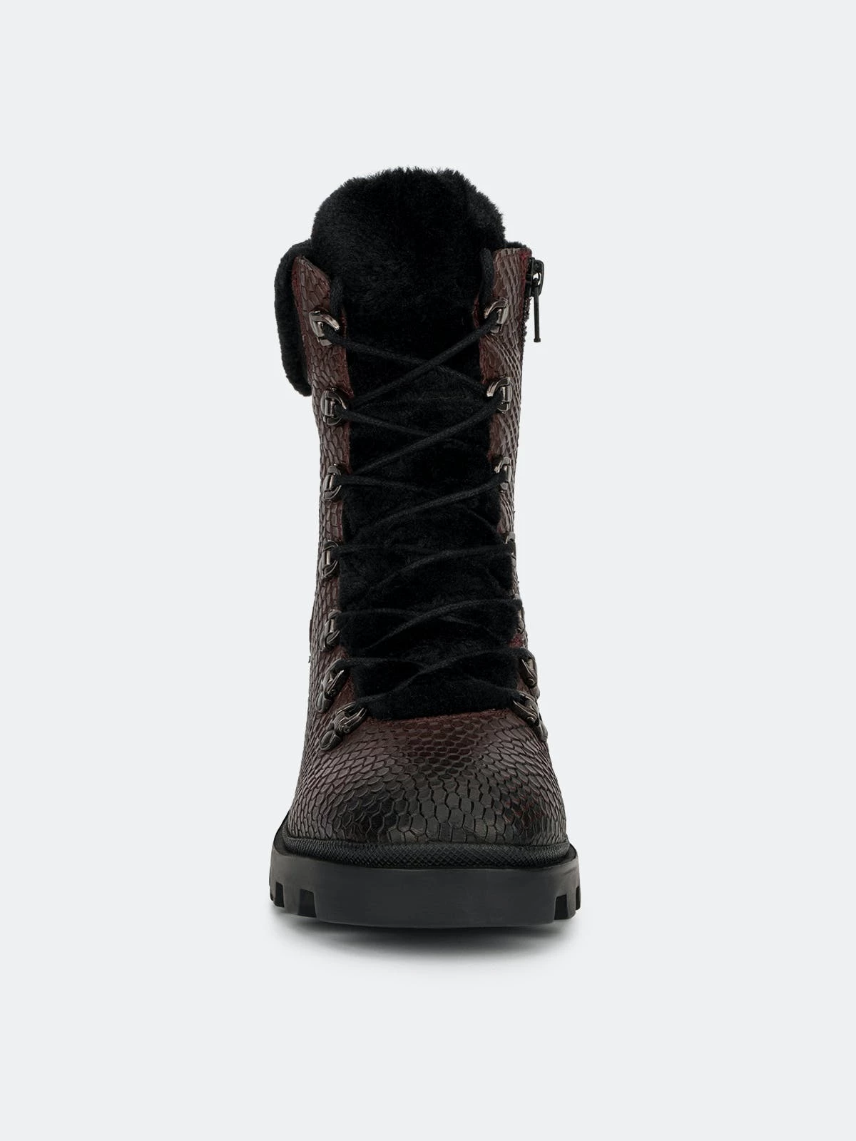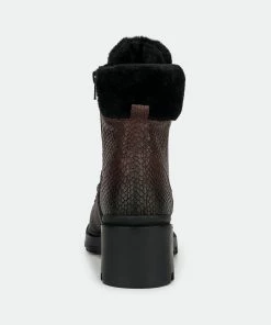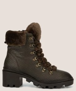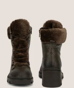 Construct the perfect cold-weather look in the Regina ankle boot. Pebbled leather upper brings a truly luxe look to this outdoor piece. Lace-up construction for a secure fit, with faux-fur trim and collar offer added warmth. Rubber lug sole adds flexible traction.